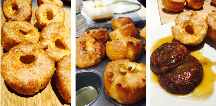 吃時多配上Gravy肉汁。Gravy是烤肉在爐架上滴在下面個盤的汁。當然現在可買現成,或用素Gravy。但其實我覺得配有汁的主菜都可配合Yorkshire pudding來吃。但其實它非常香口,沒有汁我都可吃兩個呀!傳統是吃烤或燒的菜式時伴吃的。Yorkshire pudding 焗好時中間有個洞就正確了。洞的由來,是超高溫焗時油被迫向上走而成。在洞內倒入Gravy就像有個小碗盛著醬汁。