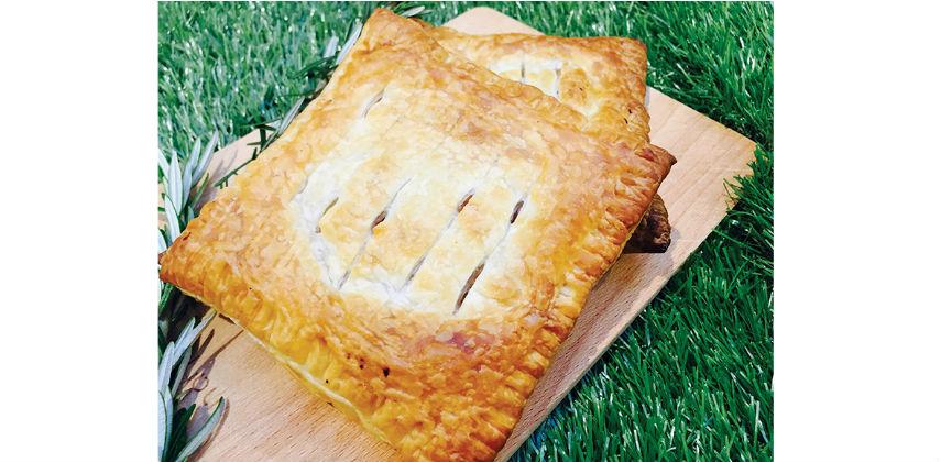 3. 酥皮在冰格取出解涷5至10分鐘。一塊切四等份。在一份的中央放上適量的餡料,四邊掃一點水。上面放上另一塊,用叉壓好四個邊,表面(界)些開囗,然後掃些無糖豆漿,入爐焗約15分鐘即成。
