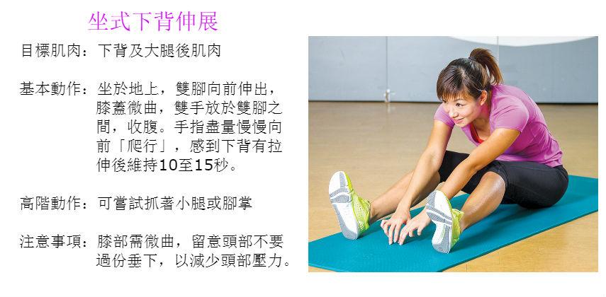 先介紹伸展動作:坐式下背伸展,與上星期的伸展動作相似,但不需要用任何工具,唯一缺點就是中央肥胖人士,或腹肌太弱人士都不能有效進行這個伸展。