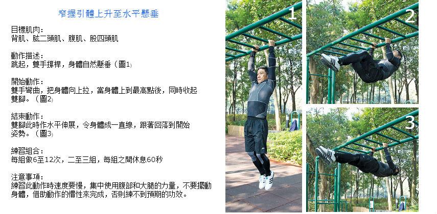 今次介紹一個綜合訓練動作,初學者可先進行窄手引體上升,如希望增加難度,可將身體拉高成水平線,增加核心肌群的參與,訓練多組肌肉。