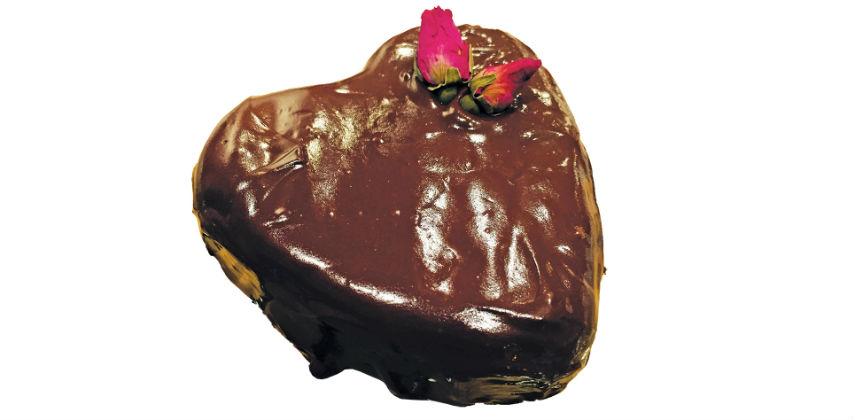 6.將朱古力甘納許醬的材料隔水煮溶,用發蛋器一面煮一面拌勻至幼滑。襯熱倒在蛋糕上並抹平。上面可加上玫瑰花乾或其他裝飾。