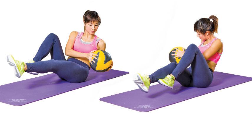 動作描述:坐在地上,做一個類似V型的姿勢,雙腳彎曲,腳掌離地,上身向後傾,保持平衡,手握藥球放在胸前。